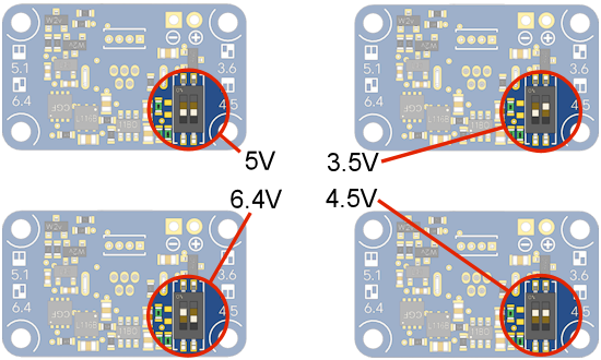 Attention: En raison de la chute de tension dans le régulateur, seules les deux premières sources d'alimentation dans le tableau ci-dessus garantissent à l'appareil une tension d'alimentation conforme au standard USB à tout moment. Dans le cas de 4C NiMH ou 1S LiPo, l'appareil recevra une tension inférieure à 4.5V, ce qui peut fonctionner avec certains appareils mais pas forcément avec tous. De nombreux modules Yoctopuce peuvent se satisfaire de 4C NiMH.