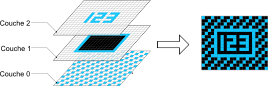Vous pouvez cacher et rendre visible n'importe quelle couche. Vous pouvez déplacer latéralement ces couches qui sont légèrement plus grandes que la surface affichable (128x128), créant ainsi un effet de scrolling. Vous pouvez mettre à profit ce système de couches pour implémenter un système de double buffering 4.
