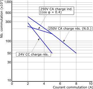 La durée de vie des contacts dépend aussi du courant et de la tension commutée, ainsi que de la nature de la charge: