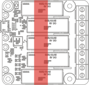 Juste devant les relais se trouve un groupe de cinq leds vertes qui indiquent quels relais sont actifs. Par défaut ces leds ont tendance à éclairer assez fort, mais il est possible de régler leur luminosité par logiciel.