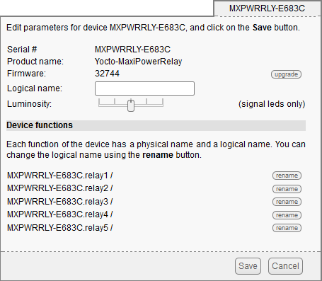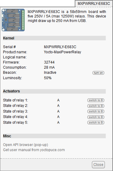 Chaque Yocto-module a un numéro de série unique attribué en usine, pour les modules Yocto-MaxiPowerRelay ce numéro commence par MXPWRRLY. Le module peut être piloté par logiciel en utilisant ce numéro de série. Ce numéro de série ne peut pas être changé.