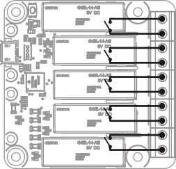Les relais eux-mêmes sont des relais électromécaniques miniatures de puissance G6RL-14-ASI à haute résistance diélectrique, fabriqués par OMRON. Prenez garde au fait que comme tous les relais électromécaniques, lors d'une utilisation en courant continu, la capacité de commutation se réduit progressivement lorsque la tension commutée monte:
