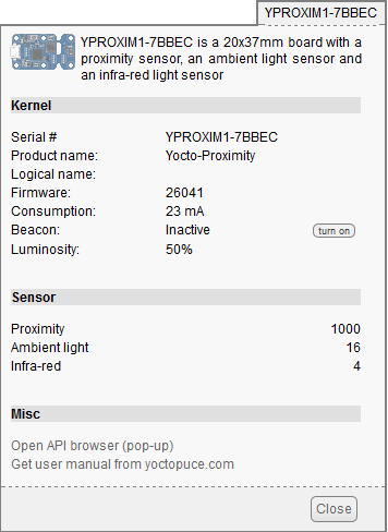 La première chose à vérifier est le bon fonctionnement de votre module: cliquez sur le numéro de série correspondant à votre module, et une fenêtre résumant les propriétés de votre Yocto-Proximity.