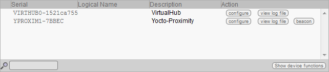 Il est alors possible de localiser physiquement chacun des modules affichés en cliquant sur le bouton beacon, cela a pour effet de mettre la Yocto-Led du module correspondant en mode "balise", elle se met alors à clignoter ce qui permet de la localiser facilement. Cela a aussi pour effet d'afficher une petite pastille bleue à l'écran. Vous obtiendrez le même comportement en appuyant sur le Yocto-bouton d'un module.
