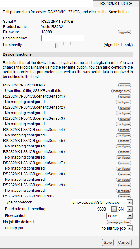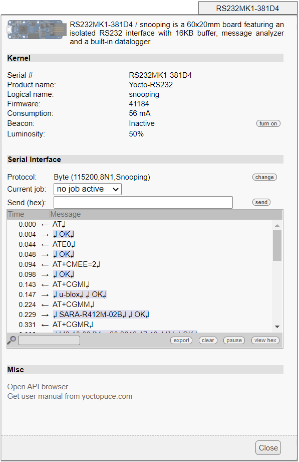 La première chose à vérifier est le bon fonctionnement de votre module: cliquez sur le numéro de série correspondant à votre module, et une fenêtre résumant les propriétés de votre Yocto-RS232.