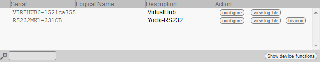 Il est alors possible de localiser physiquement chacun des modules affichés en cliquant sur le bouton beacon, cela a pour effet de mettre la Yocto-Led du module correspondant en mode "balise", elle se met alors à clignoter ce qui permet de la localiser facilement. Cela a aussi pour effet d'afficher une petite pastille bleue à l'écran. Vous obtiendrez le même comportement en appuyant sur le Yocto-bouton d'un module.