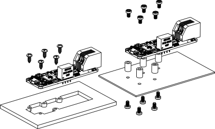 Vous pouvez monter directement le module sur le hub à l'aide d'un jeu de vis et entretoises, et les connecter à l'aide de connecteurs board-to-board au pas 1.27mm. Pour éviter les court-circuits, soudez de préférence le connecteur femelle sur le hub et le connecteur mâle sur le Yocto-RS232.
