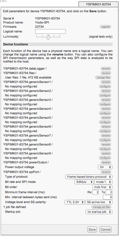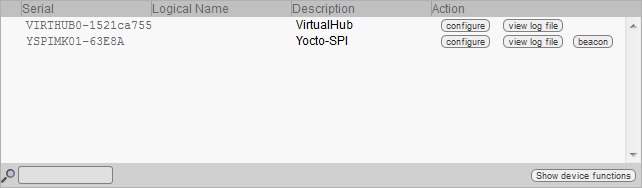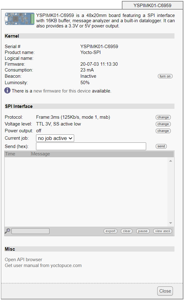 La première chose à vérifier est le bon fonctionnement de votre module: cliquez sur le numéro de série correspondant à votre module, et une fenêtre résumant les propriétés de votre Yocto-SPI.