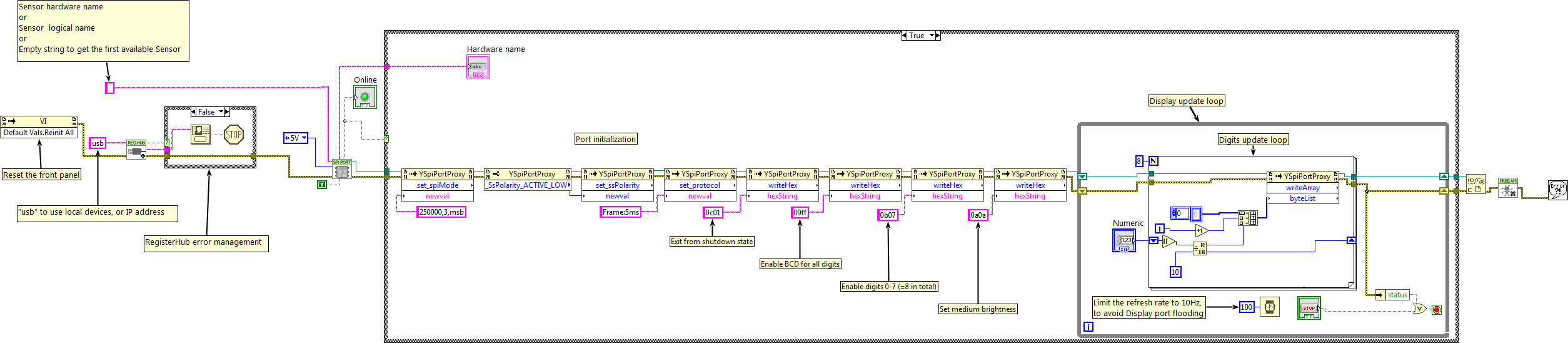 Si vous branchez un hub USB entre l'ordinateur et le module Yocto-SPI, prenez garde à ne pas dépasser les limites de courant imposées par USB, sous peine de faire face des comportements instables non prévisibles. Vous trouverez plus de détails à ce sujet dans le chapitre concernant le montage et la connectique.