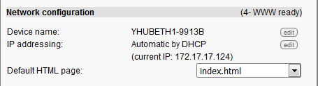 Vous pouvez aussi, en cas de besoin, configurer quelle adresse IP doit être attribuée au YoctoHub-Wireless-n. Pour ce faire, cliquez sur le bouton edit en face de la ligne ip adressing.